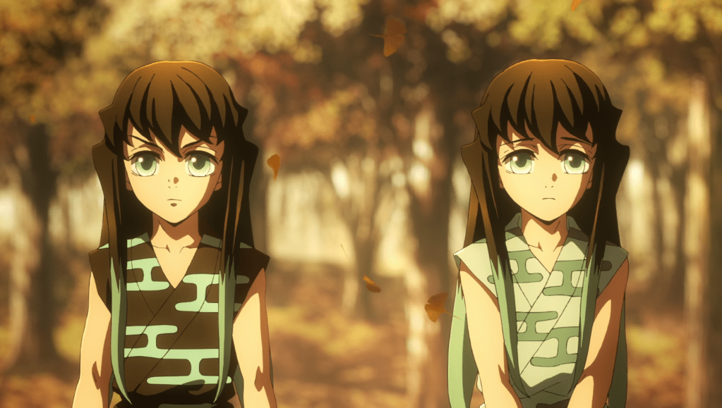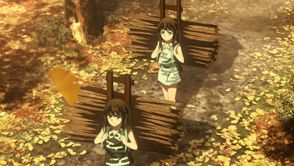 時透兄弟繼續做樵夫的情境。留意有一郎比無一郎擔起的柴枝更大更多,畫面上的銀杏葉暗示著「永恆的愛」,「一生的守候」