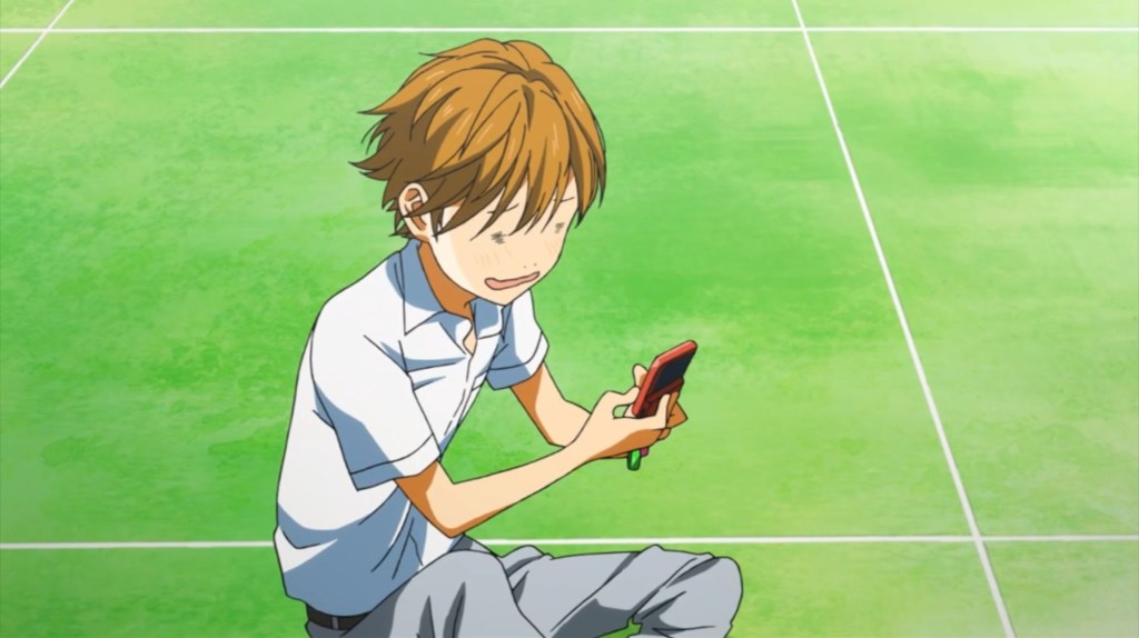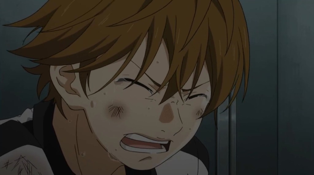 然而,小渡也不至於沒有自省的能力。在他國中生涯的最後一場比賽,他們敗了給對手,當時他的隊友直接失望到哭了出來。作為隊長的他,當然大方的承認落敗,並安慰隊友們。可是,當小渡獨自一人在廁所,讓情緒沉澱的時候,就缺堤般的哭了出來。